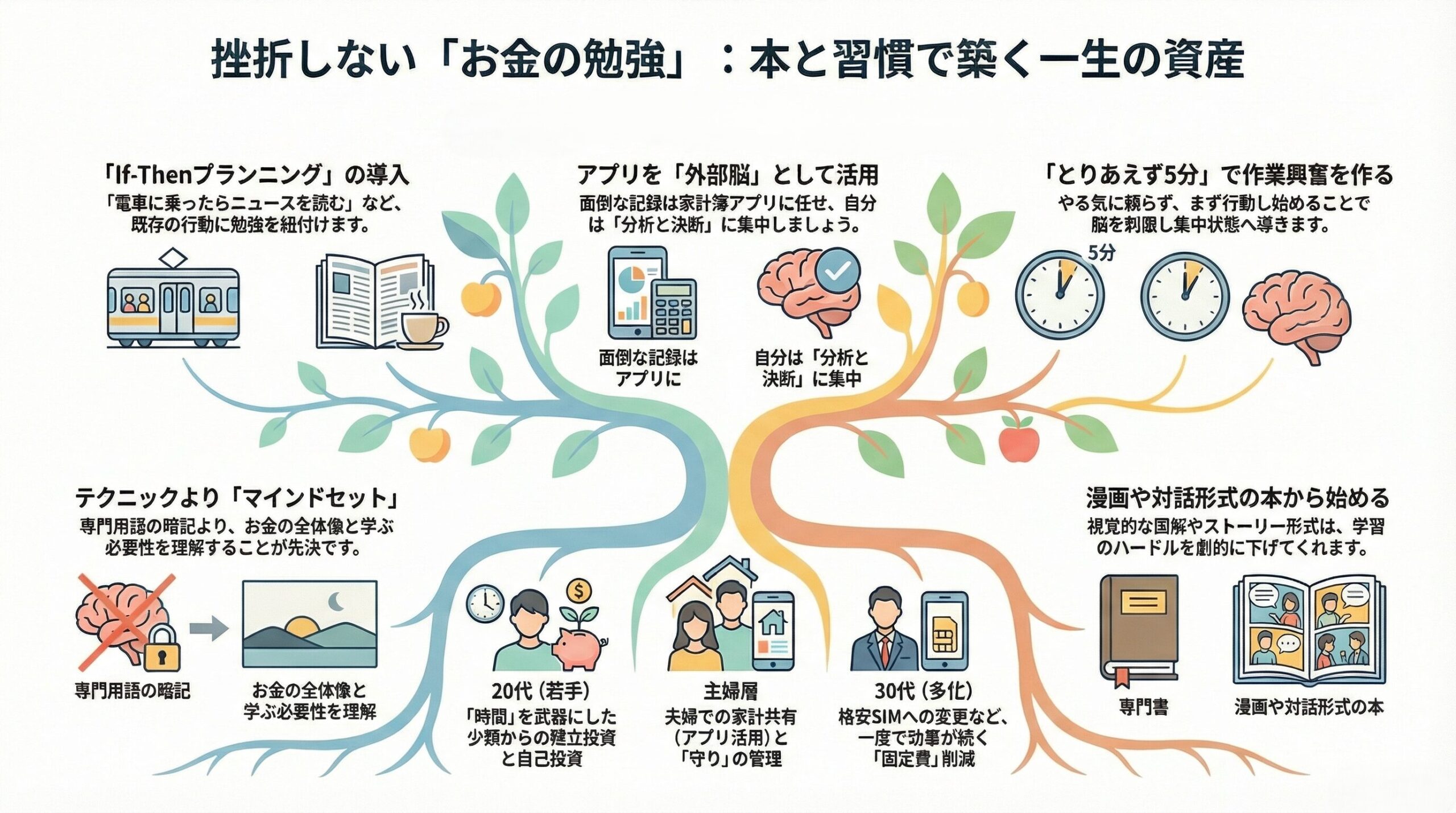 私たちが最初に取り組むべきことは、細かい投資テクニックを覚えることではなく、お金に対する「全体像」を把握することです。多くの人が陥りがちな失敗パターンが、いきなり「絶対に儲かる株式投資」のような専門書や、複雑なチャート分析の本を手に取ってしまうことです。基礎知識がない状態で高度なノウハウに触れても、専門用語の多さに脳が疲労してしまい、「やっぱり自分にはお金の管理なんて無理だ」と諦めてしまいます。まずは「お金とはそもそも何なのか」「なぜ今、お金について学ぶ必要があるのか」といったマインドセットを整えることからスタートするのが正解です。